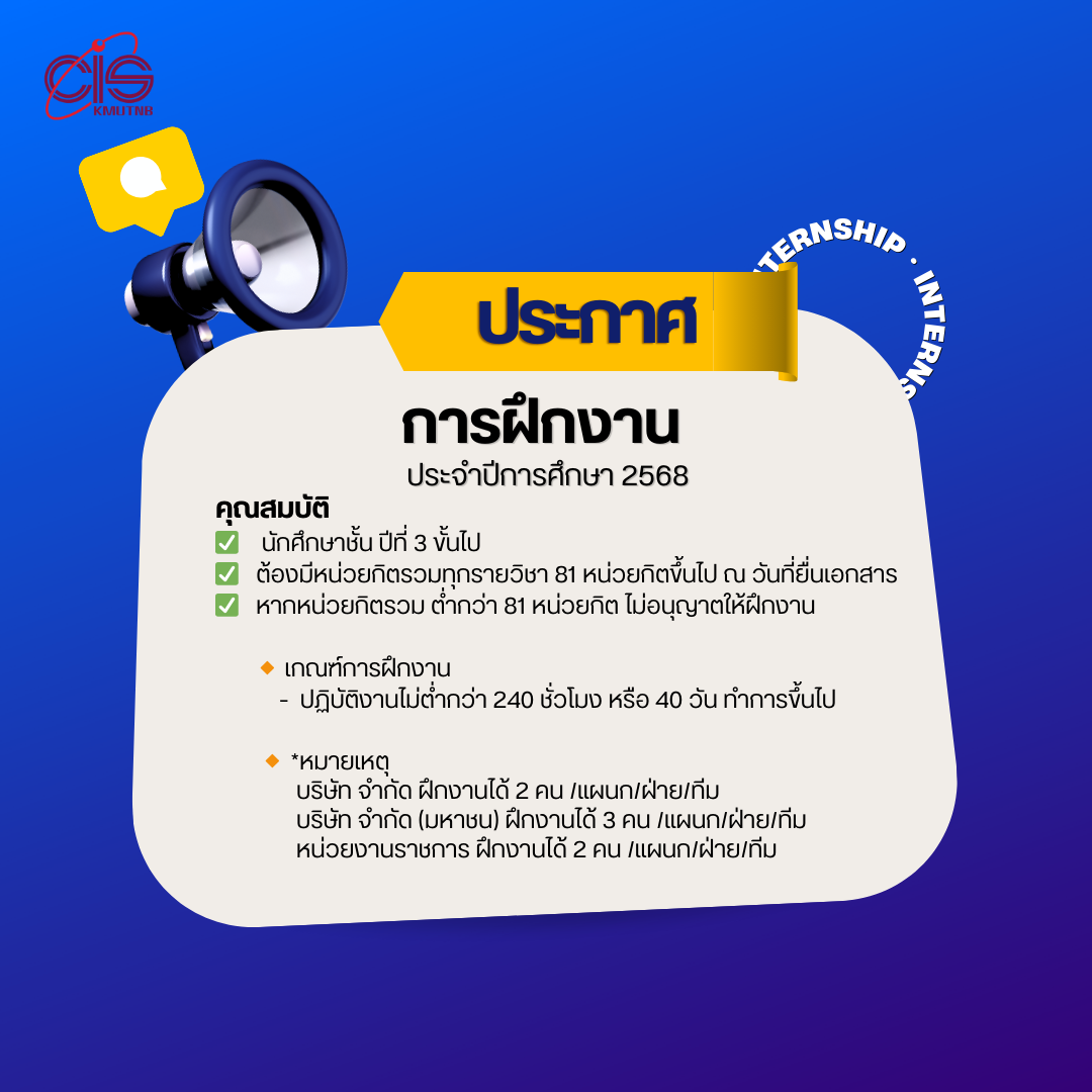 ประกาศภาควิชาวิทยาการคอมพิวเตอร์และสารสนเทศ เรื่อง การฝึกงาน ประจำปี 2568