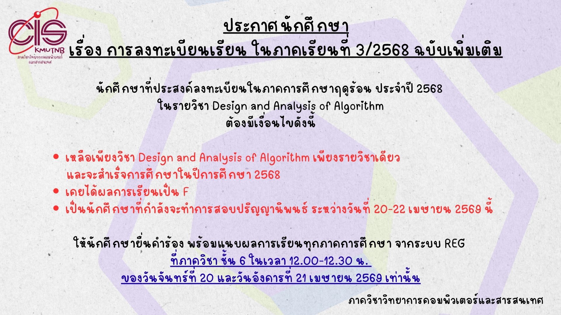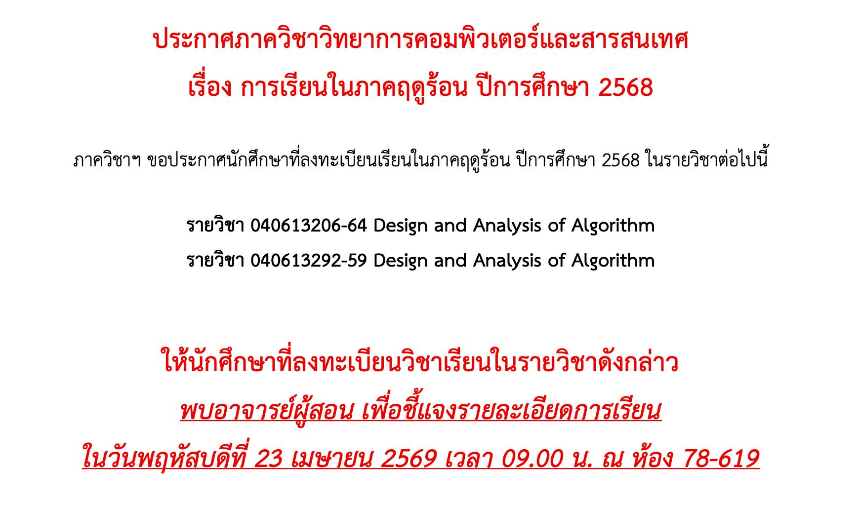 ประกาศภาควิชาวิทยาการคอมพิวเตอร์และสารสนเทศ เรื่อง การลงทะเบียนเรียนในภาคฤดูร้อน ปีการศึกษา 2568