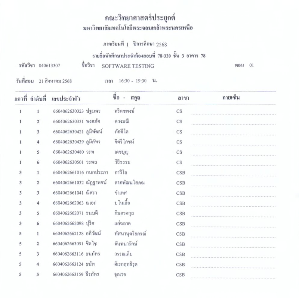 เรื่อง รายชื่อเข้าห้องสอบเพิ่มเติม ในรายวิชา 040613307 Software Testing ตอนเรียนที่ 1 เนื่องด้วยมีการตกหล่นของรายชื่อในการสอบกลางภาคเรียน ประจำภาคเรียนที่ 1/2568 ในรายวิชา 040613307 Software Testing ตอนเรียนที่ 1 นั้น ภาควิชาฯ ขอประกาศรายชื่อนักศึกษา วันเวลาสอบ และห้องสอบ ดังภาพ โดยให้นักศึกษาเข้าสอบตามวันเวลา และห้องสอบดังกล่าว จึงประกาศให้ทราบโดยทั่วกัน