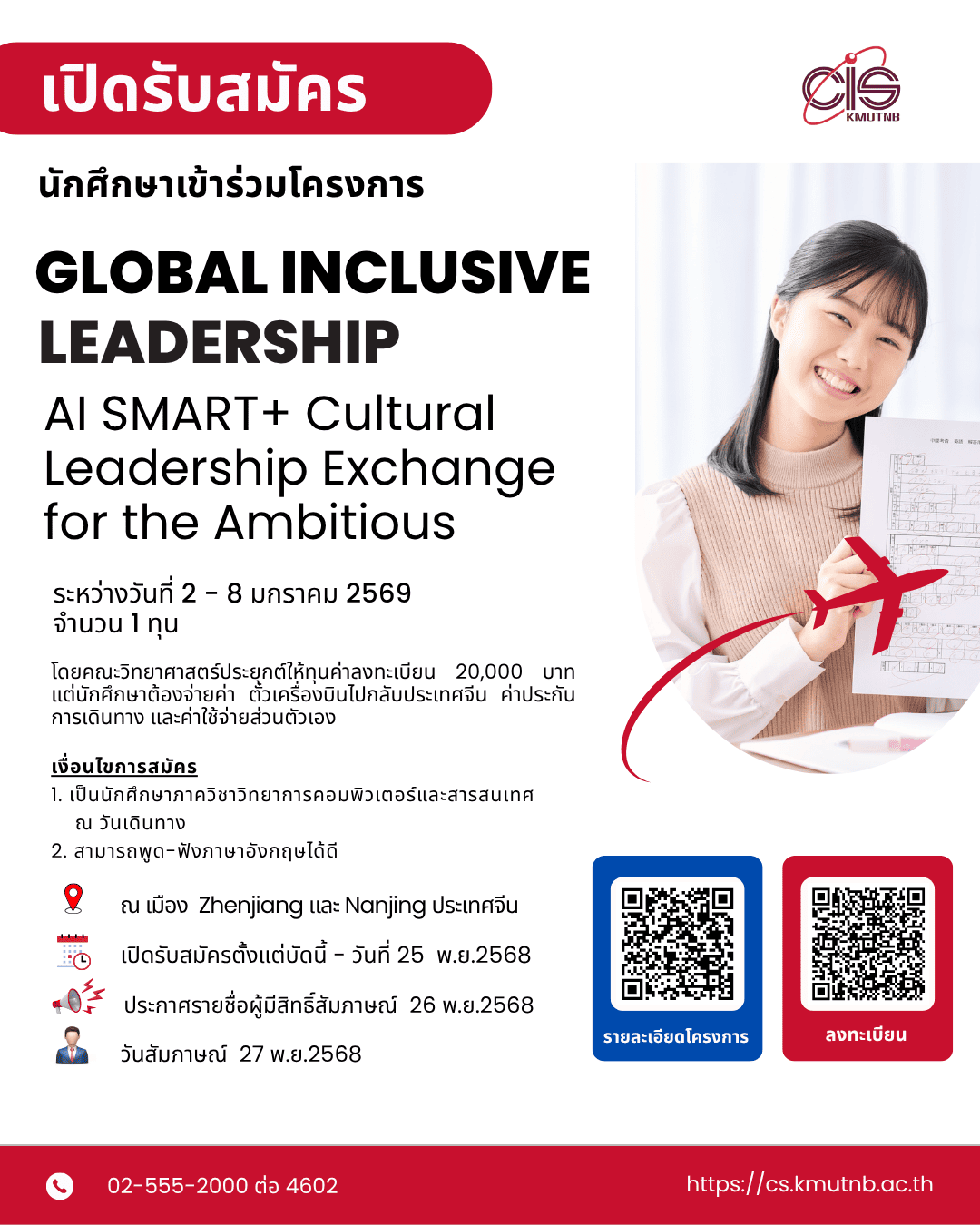 เปิดรับสมัครนักศึกษาเข้าร่วมโครงการ Global Inclusive Leadership: AI SMART+ Cultural Leadership Exchange for the Ambitious ณ เมือง Zhenjiang และ Nanjing ประเทศจีน ระหว่างวันที่ 2-8 มกราคม 2569 จำนวน 1 ทุนโดยคณะวิทยาศาสตร์ประยุกต์ให้ทุนค่าลงทะเบียน 20,000 บาท แต่นักศึกษาต้องจ่ายค่า ตั๋วเครื่องบินไปกลับประเทศจีน ค่าประกันการเดินทาง และค่าใช้จ่ายส่วนตัวเอง