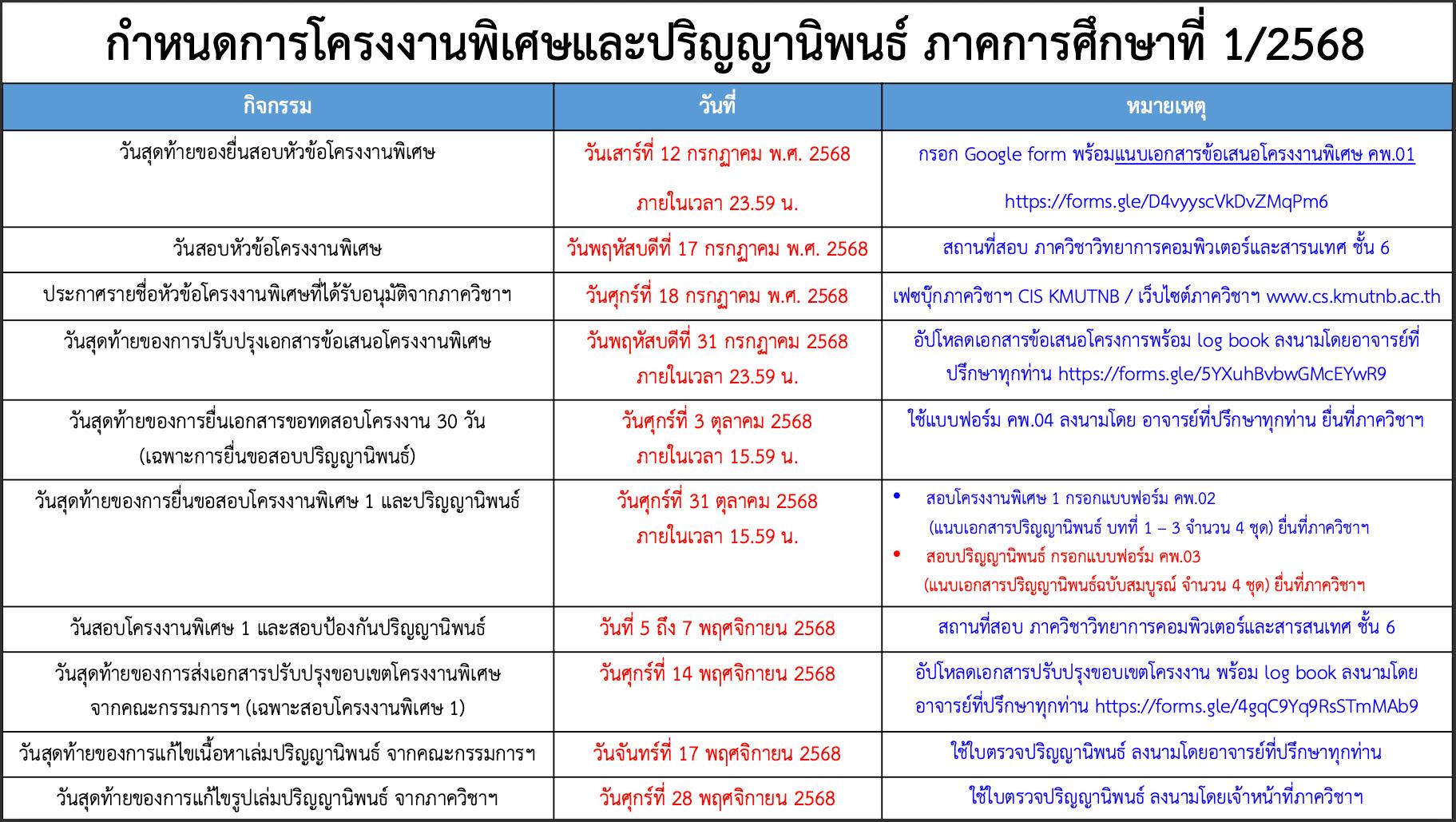 กำหนดการโครงงานพิเศษและปริญญานิพนธ์ ประจำภาคเรียนที่ 1/2568