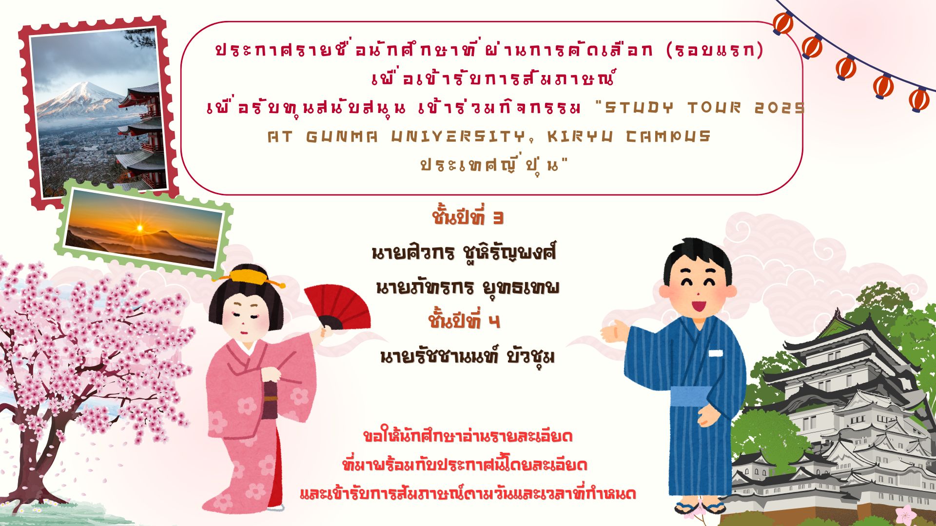 ประกาศรายชื่อนักศึกษาที่ผ่านการคัดเลือก รอบแรก เพื่อเข้ารับการสัมภาษณ์ ทุนสนับสนุนกิจกรรม STUDY TOUR 2025 AT GUNMA UNIVERSITY, KIRYU CAMPUS ประเทศญี่ปุ่น
