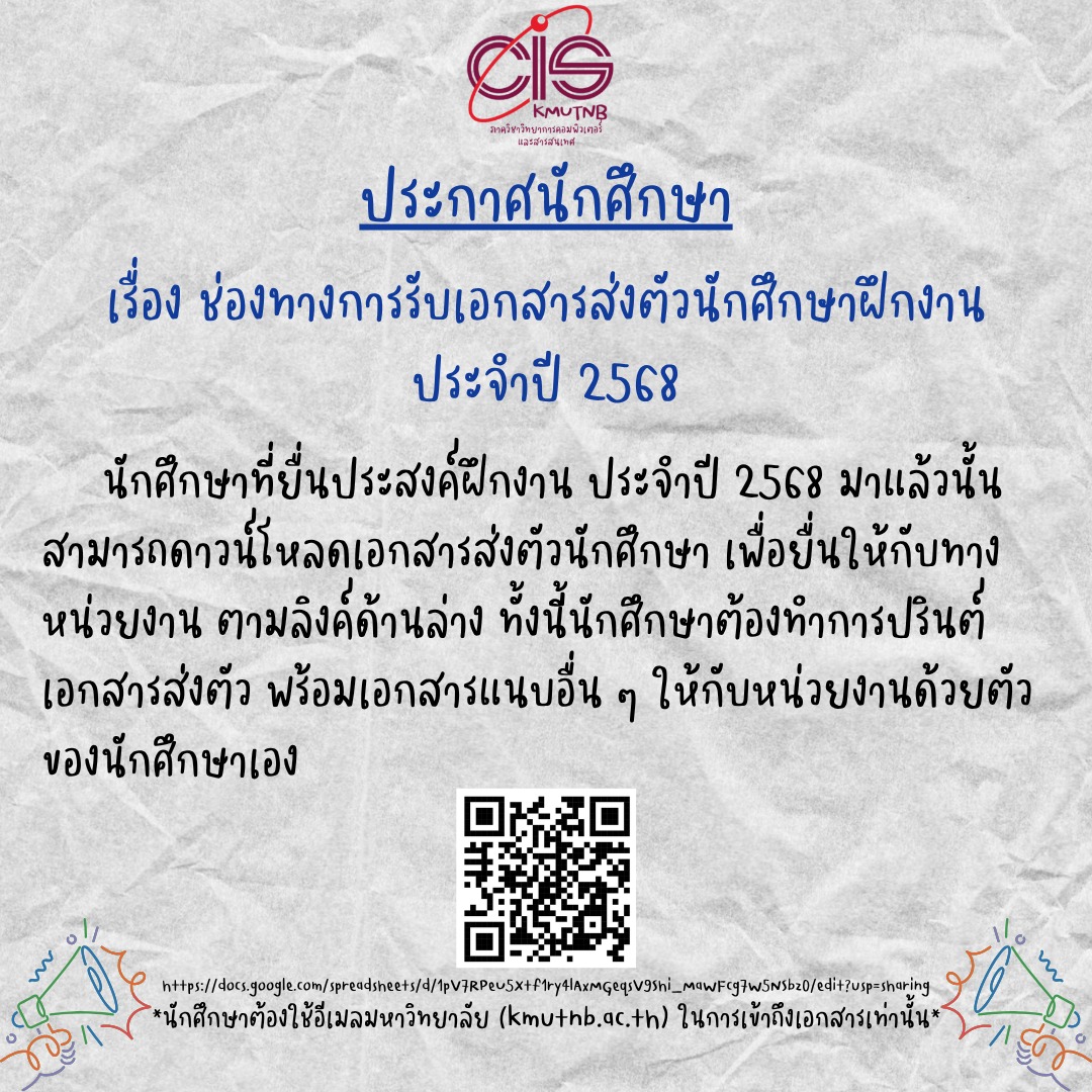ประกาศนักศึกษา เรื่อง ช่องทางการรับเอกสารส่งตัวนักศึกษาฝึกงาน ประจำปี 2568
