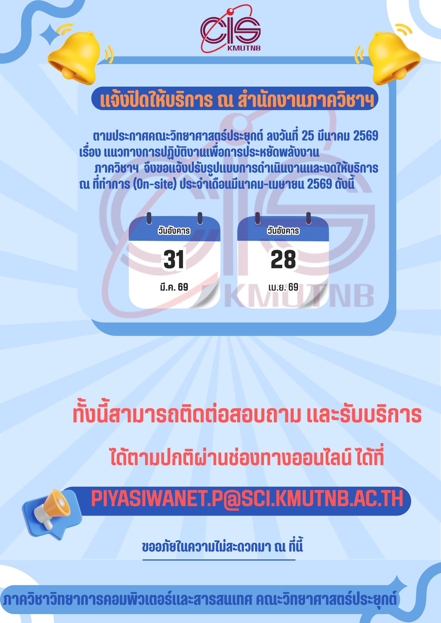 ประกาศ นักศึกษาสามารถดำเนินการตรวจสอบเลขที่นั่งสอบรายวิชาคณะวิทยาศาสตร์ประยุกต์ มจพ