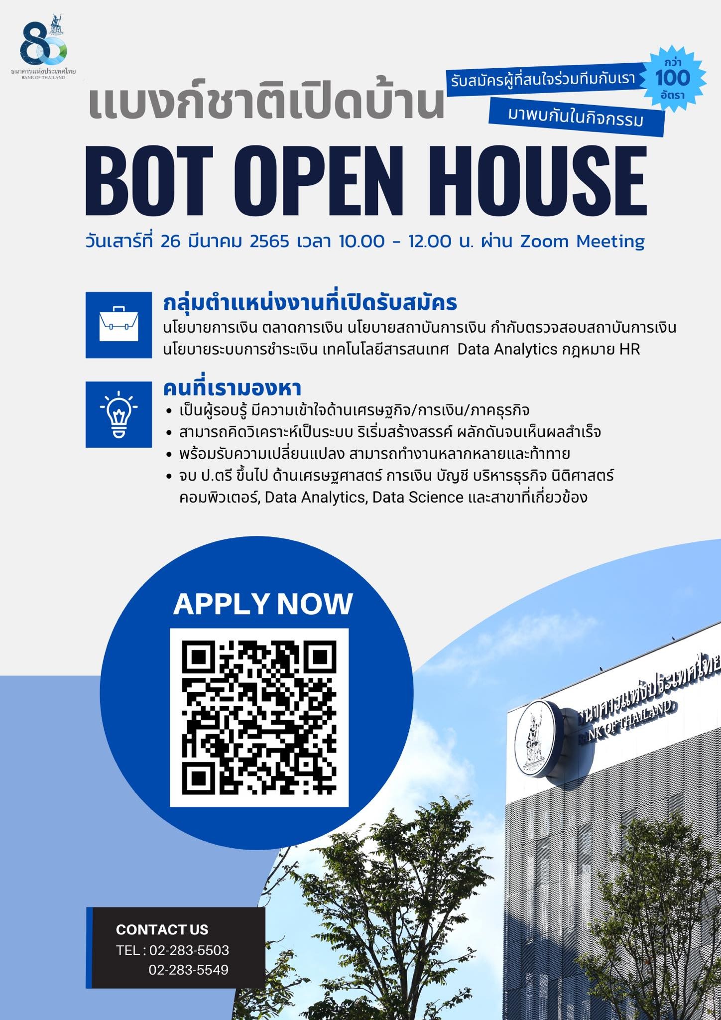 ใครสนใจร่วมงานกับเราห้ามพลาด กิจกรรม "BOT Open House 2022" ที่คุณจะได้รู้ทุกรายละเอียดเกี่ยวกับตำแหน่งงานที่เราเปิดรับ และคุณสมบัติผู้สมัครที่เรามองหา แบบไม่กั๊ก