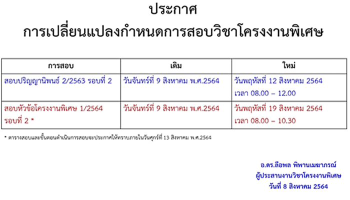 ประกาศ การเปลี่ยนแปลงกำหนดการสอบวิชาโครงงานพิเศษ