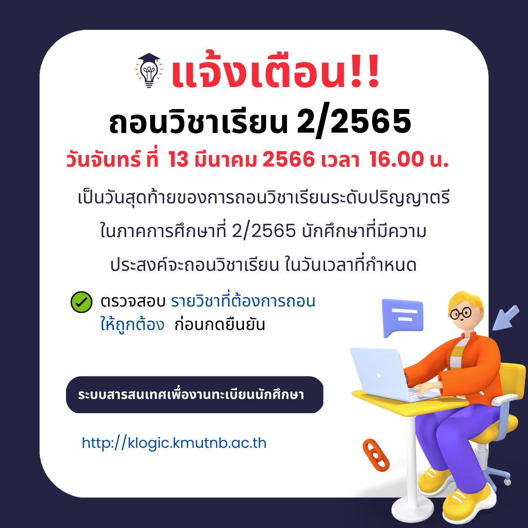 แจ้งเตือน ถอนวิชาเรียน ภาคการศึกษาที่ 2 ปี 2565