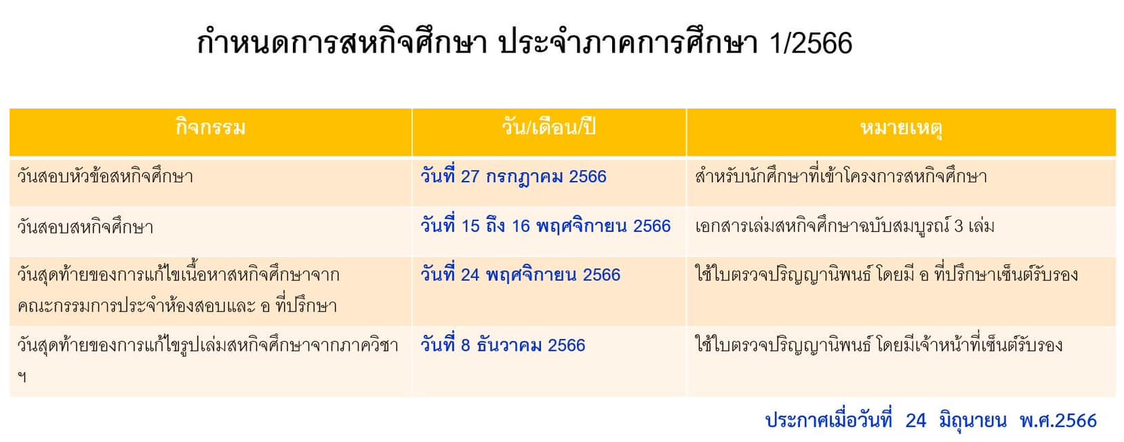 - วันสุดท้ายของการยื่นขอสอบโครงงานพิเศษ และปริญญานิพนธ์ คือ วันศุกร์ที่ 10 พฤศจิกายน 2566 ก่อนเวลา 16.00 น.