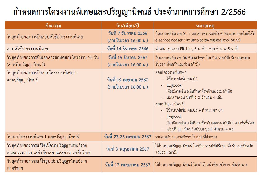 ประกาศ กำหนดการโครงงานพิเศษ 1 และปริญญานิพนธ์ ประจำภาคเรียนที่ 2 ปีการศึกษา 2566