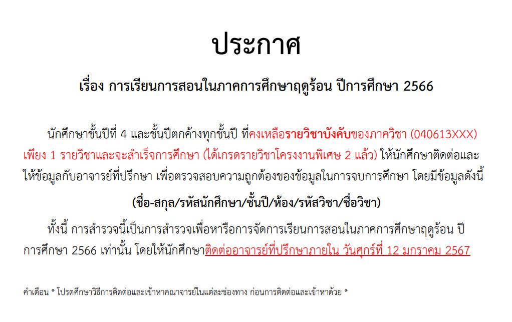 ทั้งนี้ การสำรวจนี้เป็นการสำรวจเพื่อหารือการจัดการเรียนการสอนในภาคการศึกษาฤดูร้อน ปีการศึกษา 2566 เท่านั้น โดยให้นักศึกษาติดต่ออาจารย์ที่ปรึกษาภายใน วันศุกร์ที่ 12 มกราคม 2567